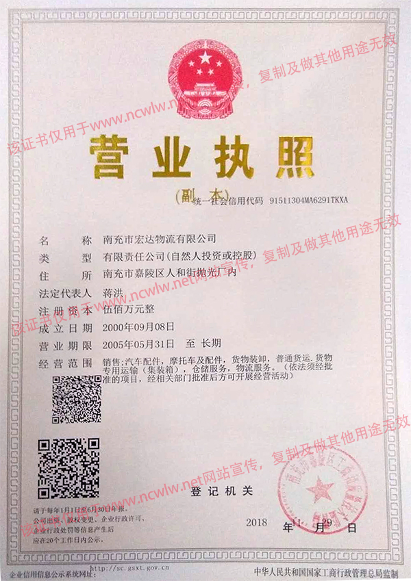 南充物流網(wǎng)(m.xinrunben.com) 南充市宏達(dá)物流有限公司營業(yè)執(zhí)照