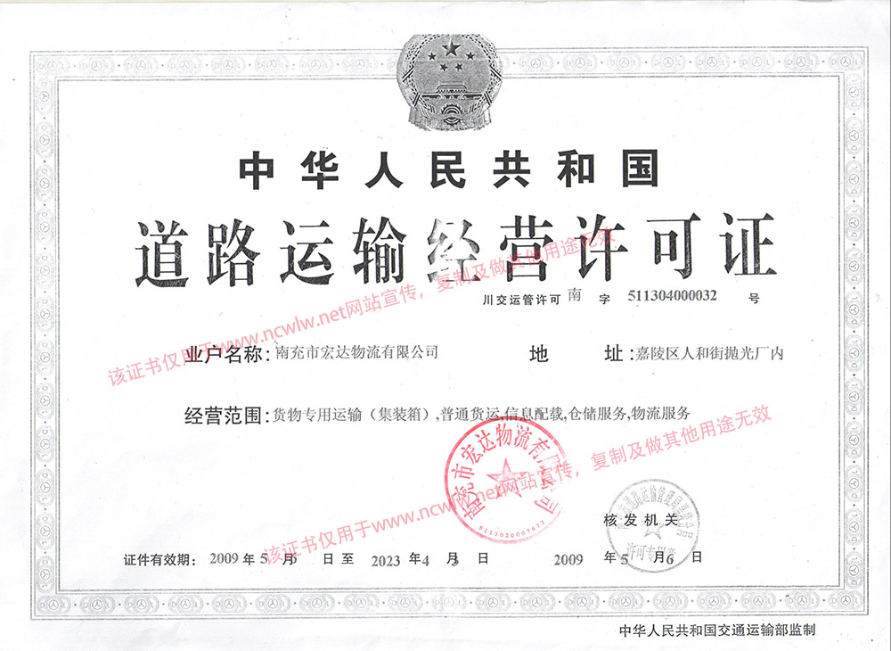 南充物流網(wǎng)(m.xinrunben.com) 南充市宏達(dá)物流有限公司道路運(yùn)輸經(jīng)營許可證